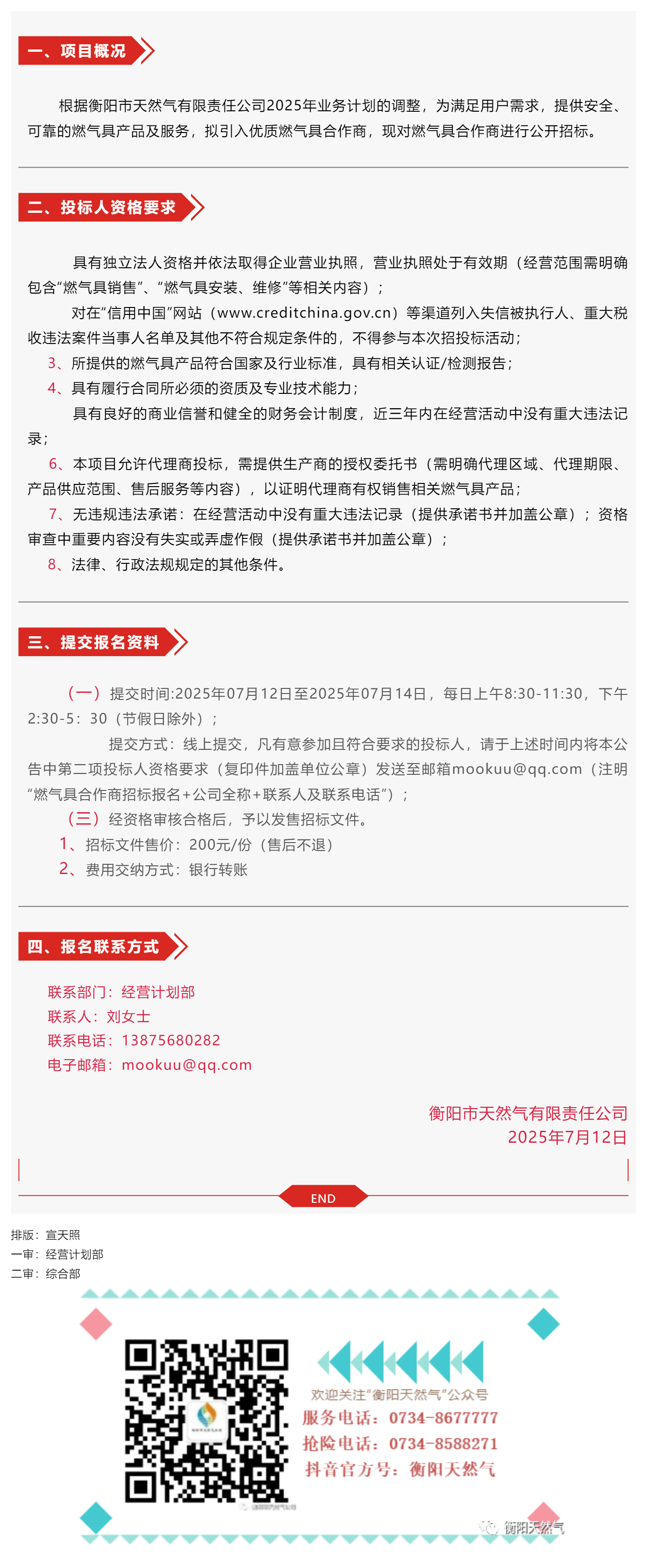 招標(biāo)公告丨衡陽(yáng)市天然氣有限責(zé)任公司2025年燃?xì)饩吆献魃倘雵袠?biāo)公告